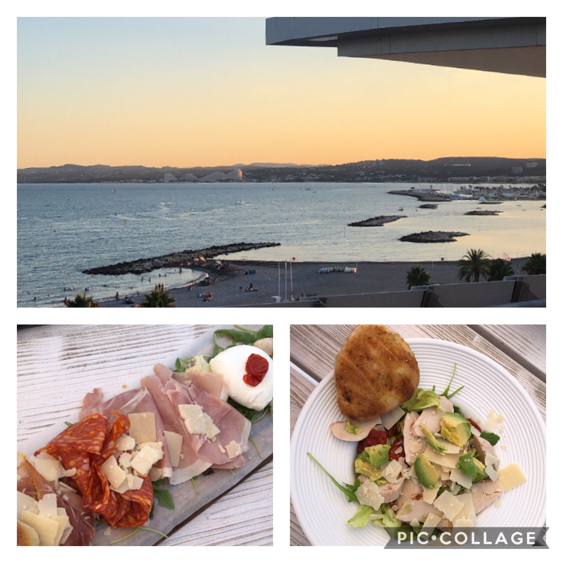 D’abord pour l’emplacement. Ce restaurant est littéralement sur le toit du centre commercial, avec une immense terrasse qui donne sur la mer. La vue va des pistes de l’aéroport jusqu’au cap d’Antibes. Et il y a même la vue de l’autre côté sur l’arrière pays niçois et les préalpes du Sud.