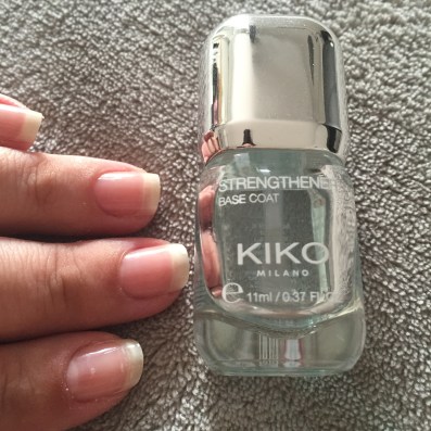 Avec avoir manucuré mes ongles (repousse des cuticules et rectificatif de la forme à la lime), j’applique ma base transparente. Pour l’occasion j’ai utilisé ma base chouchou du moment Strengthener base coat de chez Kiko.