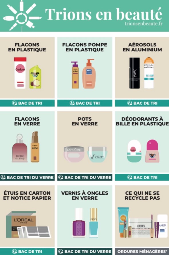 Je pense notamment aux fonds de teint, sérums, vernis ou encore parfums : ils sont à placer dans le bac de recyclage du verre. Encore une fois si le bouchon ou la pompe ne sont pas en verre il ne faudra pas le mettre dans le bac du verre mais l’ôter et le jeter avec les ordures ménagères.