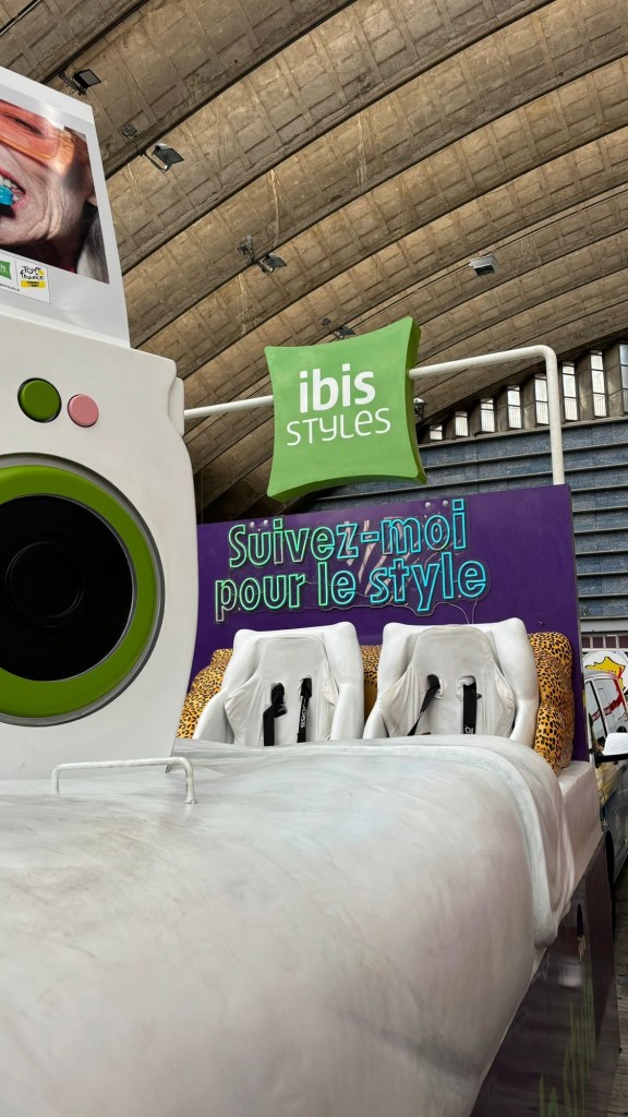 Le char sur lequel j’ai eu la chance de monter était pour la marque Ibis Styles, chaîne d’hôtel qui fait partie de la marque Ibis, dont le slogan est « toujours amusant, jamais prévisible ». Quand je terminais mes études avec plusieurs examens sur Paris je suis souvent allée dans un Ibis Style et j’aime beaucoup car ils ont une déco très design et le petit déjeuner inclus !
